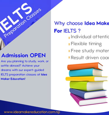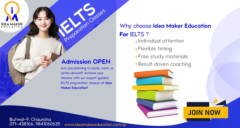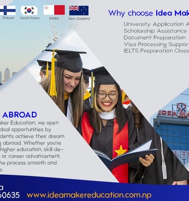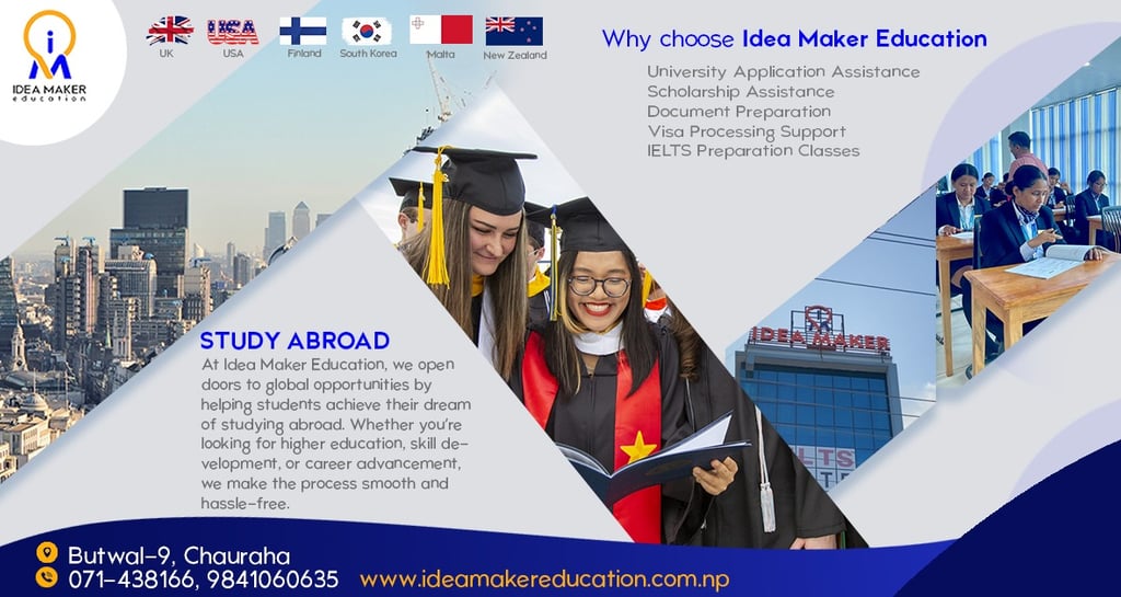 Idea Maker Education is a trusted educational consultancy based in Butwal-9 Chauraha Nepal, dedicated to helping students pursue international education. With over 10 years of experience, we offer personalized counseling, university selection, visa support, and test preparation services. We believe in honest advice, ethical practices, and a student-first approach.